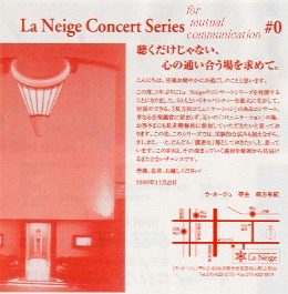 この試みは“La Neige Concert Series for Mutual Communication”の第「ゼ ロ」回にあたる。まさにこれからラ・ネージュによるコンサートシリーズが始ま る、その記念すべき最初のコンサートであった。