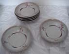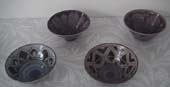 左より 青磁金彩盃 黒釉金銀彩盃 赤絵梵字組皿 色絵菓子鉢