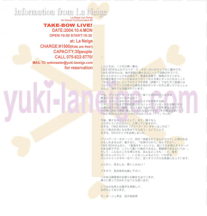 ギタリスト。1995年より活動を開始。 1998年以降、パフォーミングアーツにもその活動の幅を拡げ、多くのダンス作品やセッションのためのLIVE演奏・作曲・編曲・OPなどを手がける。 2000年、2001年にはBerlinにてSOLO LIVEを行い好評を得る。 現在もダンス作品の為の作曲やUNIT”YASU-TAKE” ”SOLITUDE” ”MALTHUS"や”RUHE RUFEN"等で活動。即興演奏家との共演等,勢力的に活動を展開中。