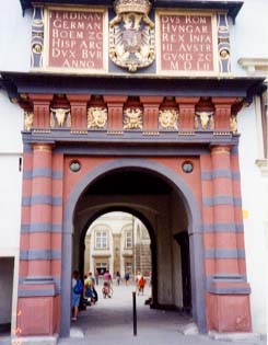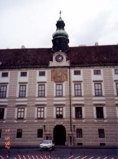 左:時計の下の日時計のようなものが気になって・・・。 右:スペイン乗馬学校の門。色使いがこの辺では異国的? |