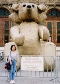 左:展覧会のために置かれた、巨大な4面テディーベアのぬいぐるみ。(雨ざらしか?) 右:同展が開催されていた「自然史博物館」。常設展は、こんな美術館のような建物に、剥製や化石の嵐! |