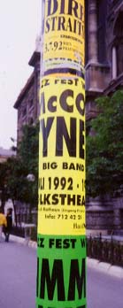 左:電柱に貼られた広告も絵になって・・。 右:そのジャズフェスティバルが催される建物。 |