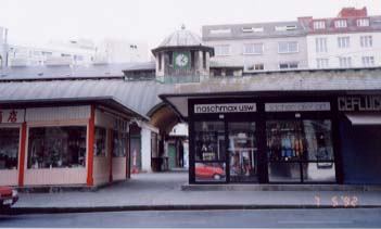 左:先程南下した際初めて見た辺りに戻る。市場のようだが、日曜で休み。 右:同市場に貼られたポスター。場所の割に音楽関係のものが多いようで、結構お洒落。 |