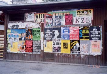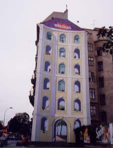 左:オットー・ワグナー建築を見ようと南下したら、こんな風景が・・。 右:同じ辺りに、壁一面を利用した絵画のようなキャットフードの広告が。 |