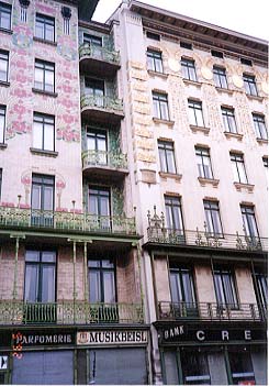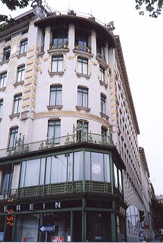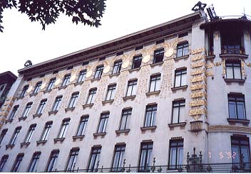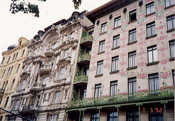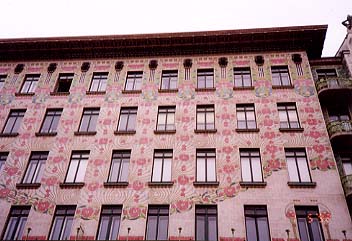 左:オットーワグナーのマジョリカハウスの左側。 右:同じく右側。屋根の四隅に金の鯱鉾ならぬ、ブロンズの女性胸像が。 |