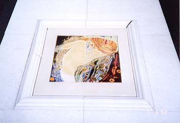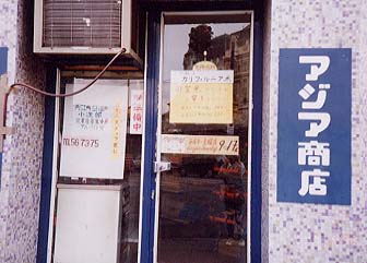 左:このゾーンの入り口にある、建物。「東洋商会」の文字が。 右:タイル屋さんのウインド−にあった、クリムトのレプリカ(パチもん?)タイル。 |