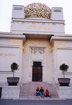 左:そこから分離派会館に向かう途中に出くわした「アジア商店」。 右:オットー・ワグナーの手による分離派会館。この近くに美術学校があるようで、座っているのは多分そこの学生。