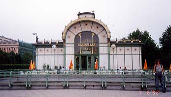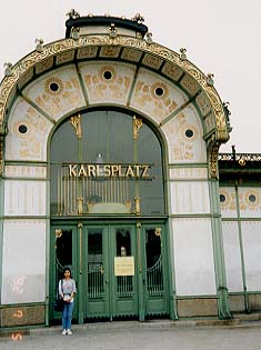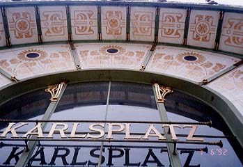 左:同会館のレリーフ。 右:オットー・ワグナー・ツアーの最後に訪ねた「カールス・プラッツ駅」の地下鉄を上がったところ。 |