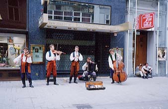 左:その前にある、瓜二つの「カフェ」 右:中心に戻ってきたところで演奏していた「ポーリッシュ・フォーク・バンド」 |