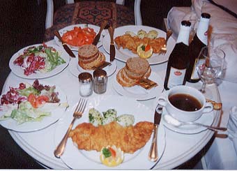 左:ホテル・ド・フランスの入り口。15年前とは様変わり。 右:ウイーン最後の晩餐。ルームサービスの「ウインナー・シュニッツェル」。 |