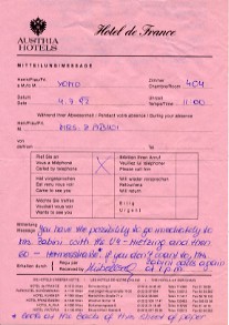 左右とも: 部屋に着いた時、ドアの下に挟まっていた、ウリからホテルへ伝言があった、家への行き方のメッセージ。 |