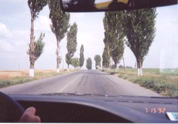 | ひまわり畑と並んで道の両側に必ずあった木のある風景。幹の下に白く塗ってあるのが夜光塗料で、ライトが当たると光る。 | |