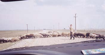 これもおなじみ、羊達と羊飼いの少年。渡りきるまでじっと停まって待つ。 |