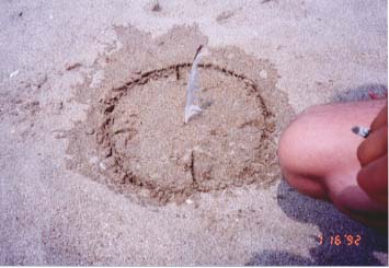 マリウスが浜辺に作った日時計。インディアンスタイルだそう。 |