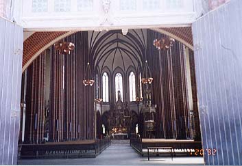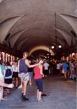左:スケンニッツェと呼ばれるところ。土産物屋がずらりと並ぶ。 右:14世紀にできたとされる、聖マリア教会内部。ブルーが美しい。 |