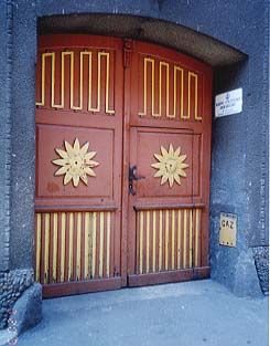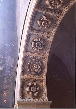 左:同じく中庭の部分。 右:中庭に続く門のアーチの内側のレリーフ。 |