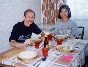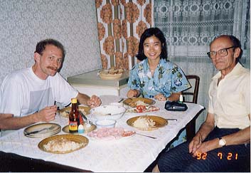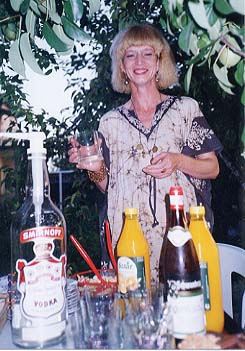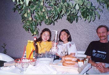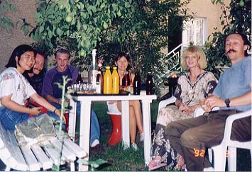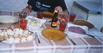 左:度肝を抜かれたディスペンサーつき「スミルノフ」を囲んで。手前は巨大なポーリッシュ・ソーセージ。最高に美味しい。 右:たくさん集まってくれたお友達と。クリストフの横は、彼の弟。右端はイオラのボーイフレンド。 |