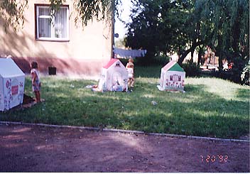 左:先程の続き、豚のローストカリフラワー添え、ポテト、赤キャベツのサラダ、トマトのサラダ。 右:女の子達が夢中になって遊んでいた、「おうち」。お洒落! |