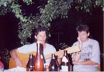 左:ギターで弾き語る、シャーマンのような女性のボーイフレンド。その右の男性は、右上の写真中央の女性と、この後車でパリへ。 右:中央奥が、シャーマンな女性。 |