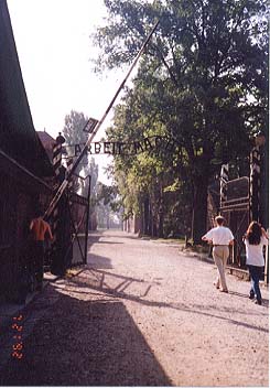 左:来てしまった、アウシュビッツ収容所後の駐車場。 右:有名な「働けば自由になれる」の門。 |