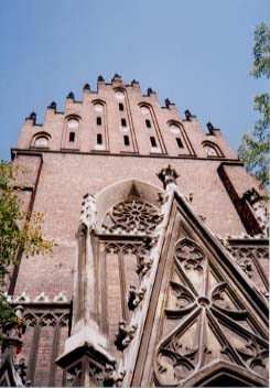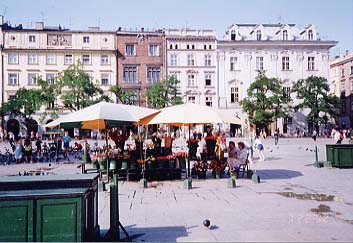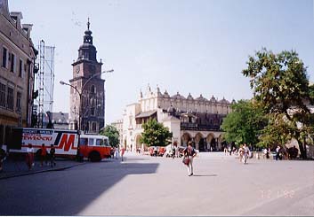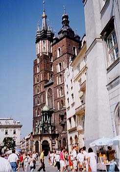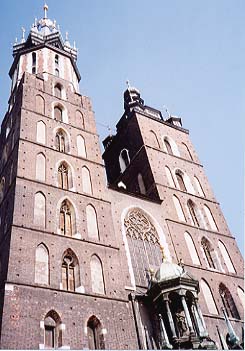 左:クラクフの町の入り口。 右:美しき古都、クラクフの美しい教会の一つ、聖マリア教会。左右の塔の高さが違うのがいわくつき。 |