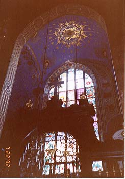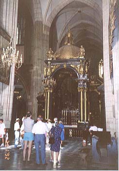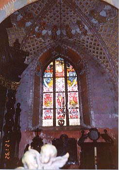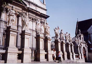 左:石柱に立ち並ぶ彫像が全て美しい。聖アンジェイ教会か? 右:Wawel城内にあるカテドラルの内部。天井画が日本のお寺に通じる色彩。この地模様は青海波?空を表すのか? |