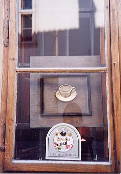 左:コーヒーの金属のレリーフが可愛いでしょう? 右:中心部の教会の正面。 |