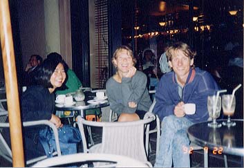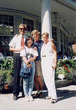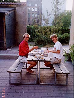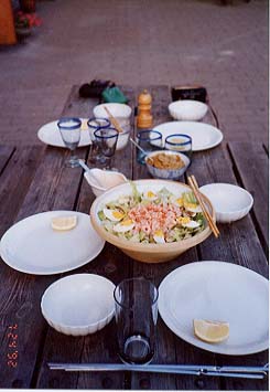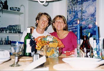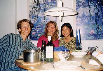 左:最初の晩餐のテーブル。トルベンとリーネと。 右:私達のお土産と共に。 |