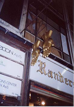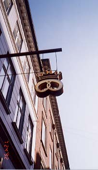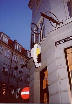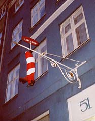 左:夕食後散歩に出た、コペンハーゲン市内の雰囲気。 右:お店にはよく、昔からのシンボルが掲げられている。これは、「靴屋」ではなく、「床屋」さんのシンボル。 |