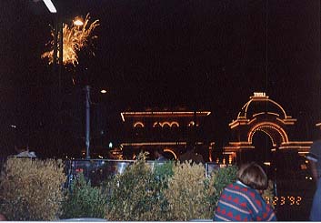 左:チボリ公園の花火を見るために、向かい側のカフェに陣取る。 右:ライトアップされた建物と花火。大人の雰囲気。 |