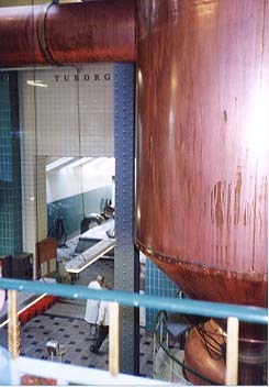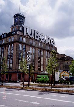 左:スウェーデンから来たサンタに捕まった私達。 右:奥のタイルにもさりげなく「TUBORG」の文字が入った、美しい工場。美味しそう! |