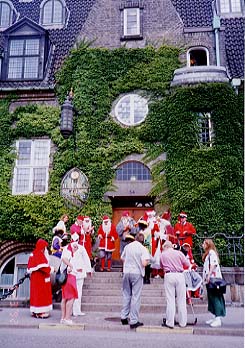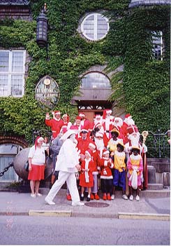 左右とも:蔦の絡まる正面玄関の前で、クリスマス・ブリューを試飲した世界中から来たサンタ達が大集合。記念撮影の現場を、テレビクルーも取材。 |