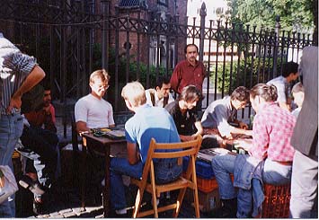 左:街角で、白昼堂々、一応禁止されているらしいボードゲームでのギャンブルを楽しむ人々。 右:王冠シリーズ。 |