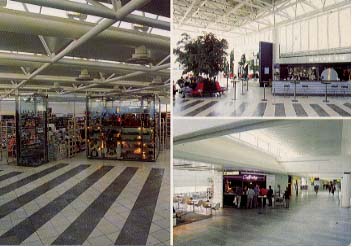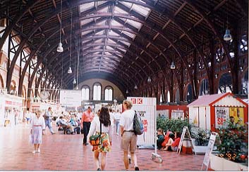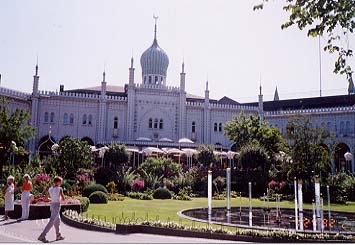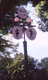 左:コペンハーゲン中央駅構内。木製のアーチが美しい。 右:チボリ公園内のお手洗いの表示。空中ブランコ乗りの女性(?)とピエロの組み合わせ。何だかお洒落。 |
