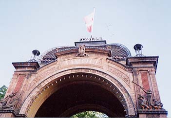 左:園内の風船売り。日本とは違う芋虫キャラが結構充実。 右:歴史が感じられる門。 |
