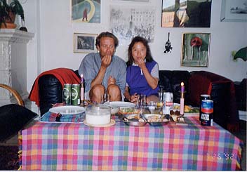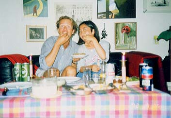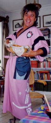 左:上の続き。今度はおいしい顔で写す。 右:友達(非日本人)から贈られた浮世絵に感じ入りの手作りローブをまとい、焼きたてのクロワッサンをサーブしてくれるギュンター。 |