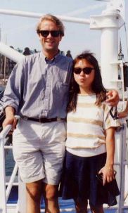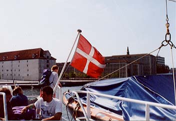 コペンハーゲンからマルメへと向かう国際渡し舟で。 左:「チーズ」をスウェーデン語で言ってみたところ。 右:船の後ろにはためくデンマーク国旗。 |