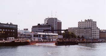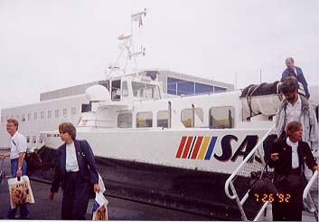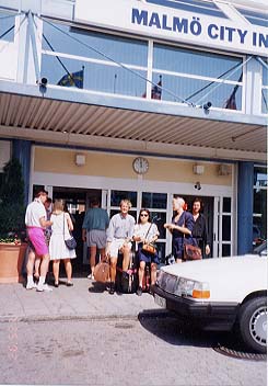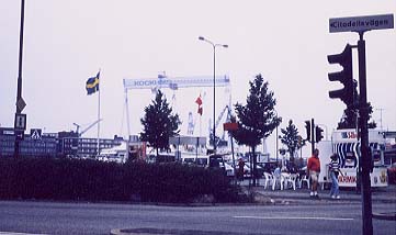 左:この白地に水色で文字の書かれたドックがマルメのシンボルらしい。ここにもスウェーデン国旗。 右:コペンハーゲン空港行きのSASの運行するホバークラフトで、空港に着いたところ。 |