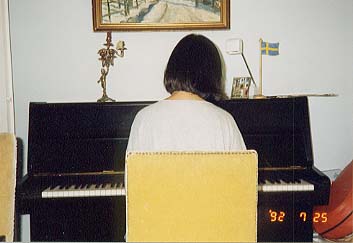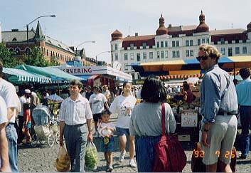 左:同じくパトリックのフラットのピアノを弾く。ピアノの上にも小さなスウェーデン国旗。 右:近くのバザール。 |