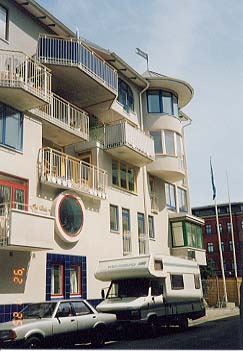 左:コペンハーゲンと比べると、一つ一つの建物がもっと大きくガタイのいい感じの、マルメの街。 右:共同住宅への入り口。赤い凧の中に見える白い部分に入居者の名前があり、真中のボタンを押し、開錠してもらうようになっているよう。 |