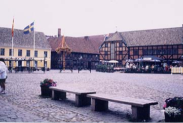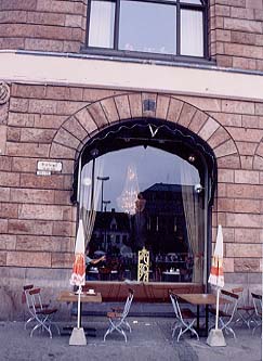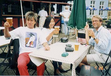 左:旧市街を散策中、テラスでビールで乾杯。ギュンターが着ているのが私達のお土産の浮世絵Tシャツ。私が着ているのはギュンターにもらったゲーテインスティテュートのTシャツ。 右:古い建物は何だか可愛らしい。ここにもスウェーデン国旗。 |