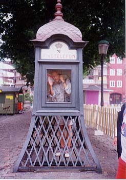 左:木が斜めになっているところには、レンガも斜めになっている。 右:建物に会わせて古いスタイルの公衆電話ボックスでポーズを取るパトリック。窮屈そう。 |