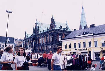 左:ヘンリー・ムーアの彫刻のような遊具(か、はたまた彫刻に勝手に乗っかっているのか?)。街とアートのいい関係?! 右:緑青の屋根が美しいのは、確か市庁舎。正面にはたくさんのスウェーデン国旗。 |