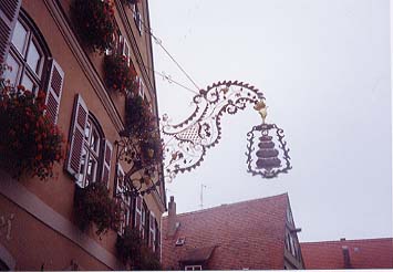 左:ディンケルスビュールの典型的な家たち。 右:ここの窓辺を飾る花は珍しく、パステルカラーで、大人の雰囲気。 |