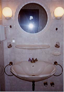 左:ホテルの部屋の洗面所。シンクなどおとぎ話のよう。 右:結婚式の儀式に使うのか?わら人形が・・・。 |