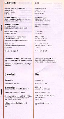 左右とも:この旅最後のフライトとなった、フランクフルト--大阪間の機内食メニュー。 |