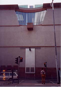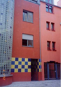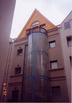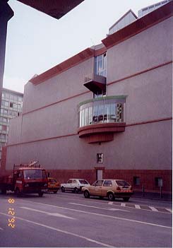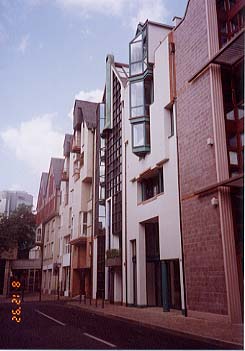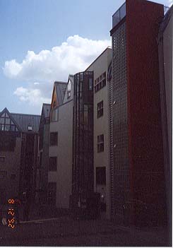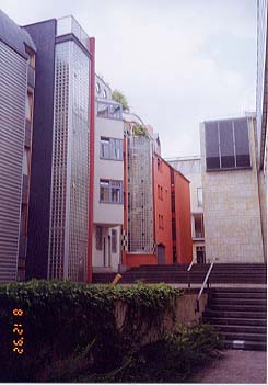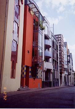 左:中には入れなかったが、これも新しく、面白い建物。 右:左の建物の裏に見つけた、楽しいデザインの集合住宅群。 |