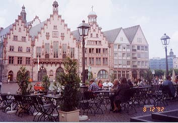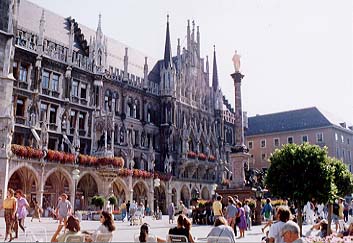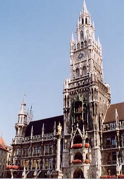 左:ミュンヘンの市庁舎前。左側の真ん中の部分が有名なからくり時計。 |