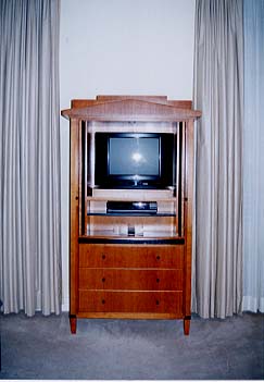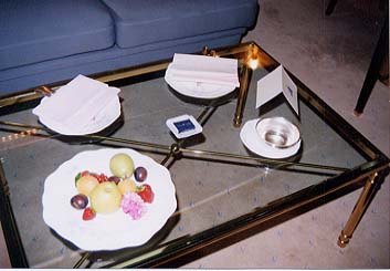 左:テレビの棚だった。 右:ウエルカムフルーツまでフィンガーボールと共に用意されていて感激。 |