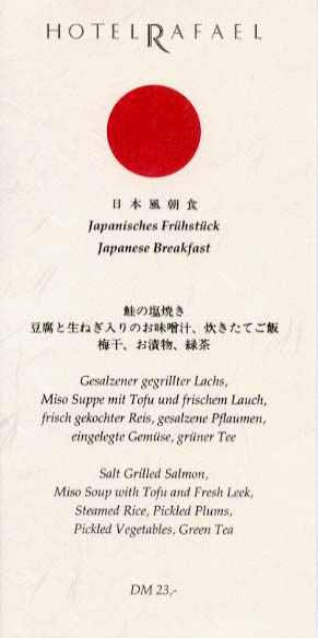 左:日本風朝食のメニュー。 右:ミュンヘン観光局の出している、『ドイツ語、ことば絵本。』これも部屋に置いてあった。 |